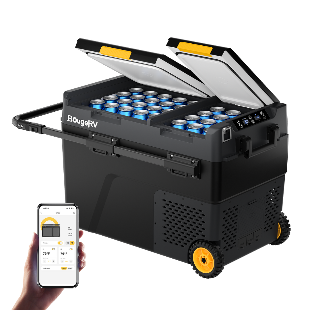 The BougeRV CR Dual-Zone portable fridge freezer features independent temperature control. You can use one side as a refrigerator and the other side as a freezer. Whether you want to keep your drinks chilled or preserve your meats and perishables, this 12v dual zone fridge has got you covered. It also features a handy app to easily and accurately control the temperature settings from your smartphone. Whether you're on a road trip, or camping adventure, or simply need extra cooling space at home, the BougeRV CR Dual Zone fridge is the perfect companion for all your cooling needs.