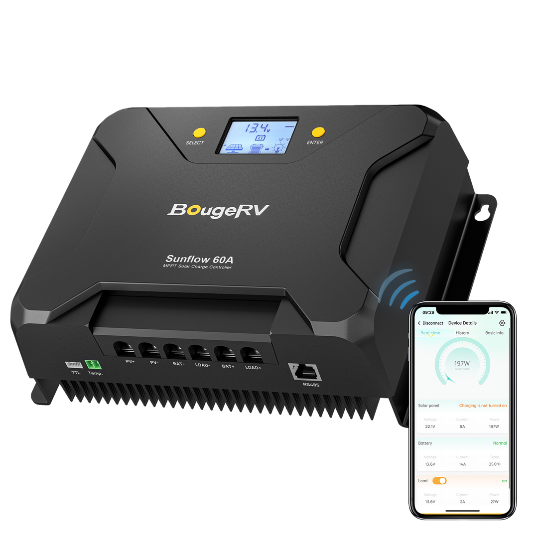 The voltage of the controller should be the same as the voltage of the battery. For example, if the battery is 12V, it is necessary to select a 12V solar charge controller. BougeRV solar charge controller has good compatibility, it recognizes battery voltage automatically and can be used for charging batteries with 12V/24V/36V/48V.