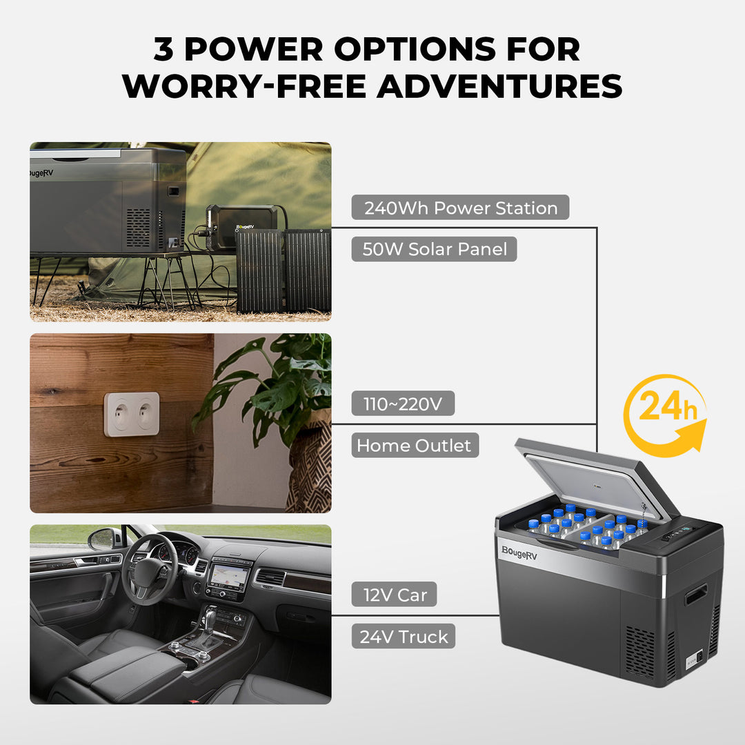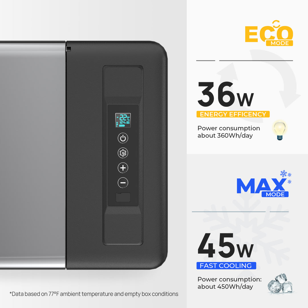 Avec le mode ECO, le réfrigérateur portable BougeRV consomme moins de 45 W d'énergie, ce qui en fait une solution économe en énergie pour toutes vos aventures en plein air. Le mode MAX utilise un cycle de travail intelligent qui consomme moins de 1 kWh par jour, garantissant une consommation d'énergie minimale tout en gardant vos aliments et boissons au frais.
