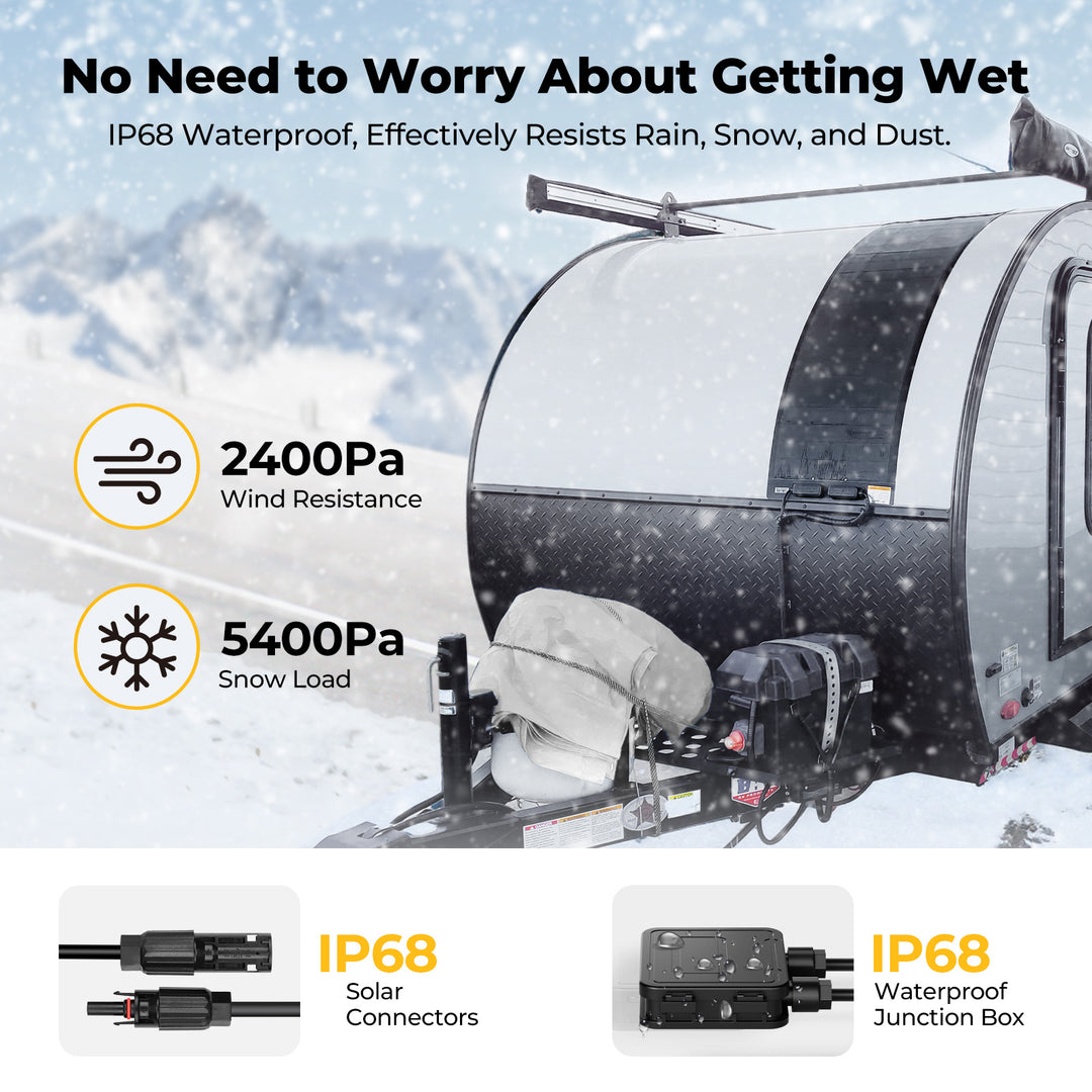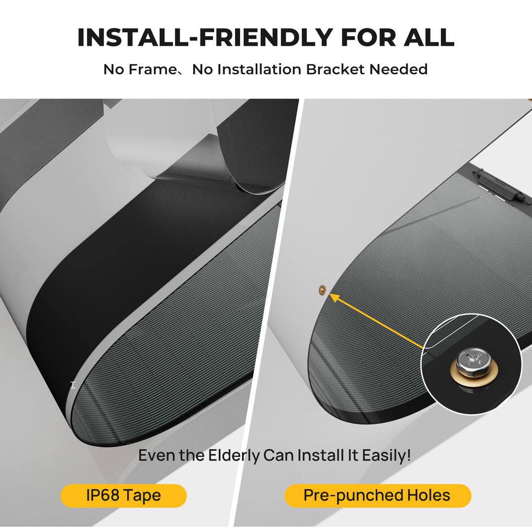 Le panneau solaire flexible CIGS de 200 watts avec adhésif est doté d'un support adhésif pré-assemblé qui élimine le besoin de supports et de perçages lors de l'installation. Aucun outil n'est requis pour une installation facile et sans tracas.