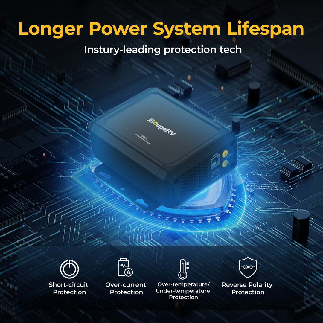 BougeRV smart algorithm offers comprehensive protection for your vehicle, the charger, and your power station. This includes protection from over-voltage, reverse polarity, over-current, and temperature extremes. The intelligent, silent fan system keeps noise under 50dB