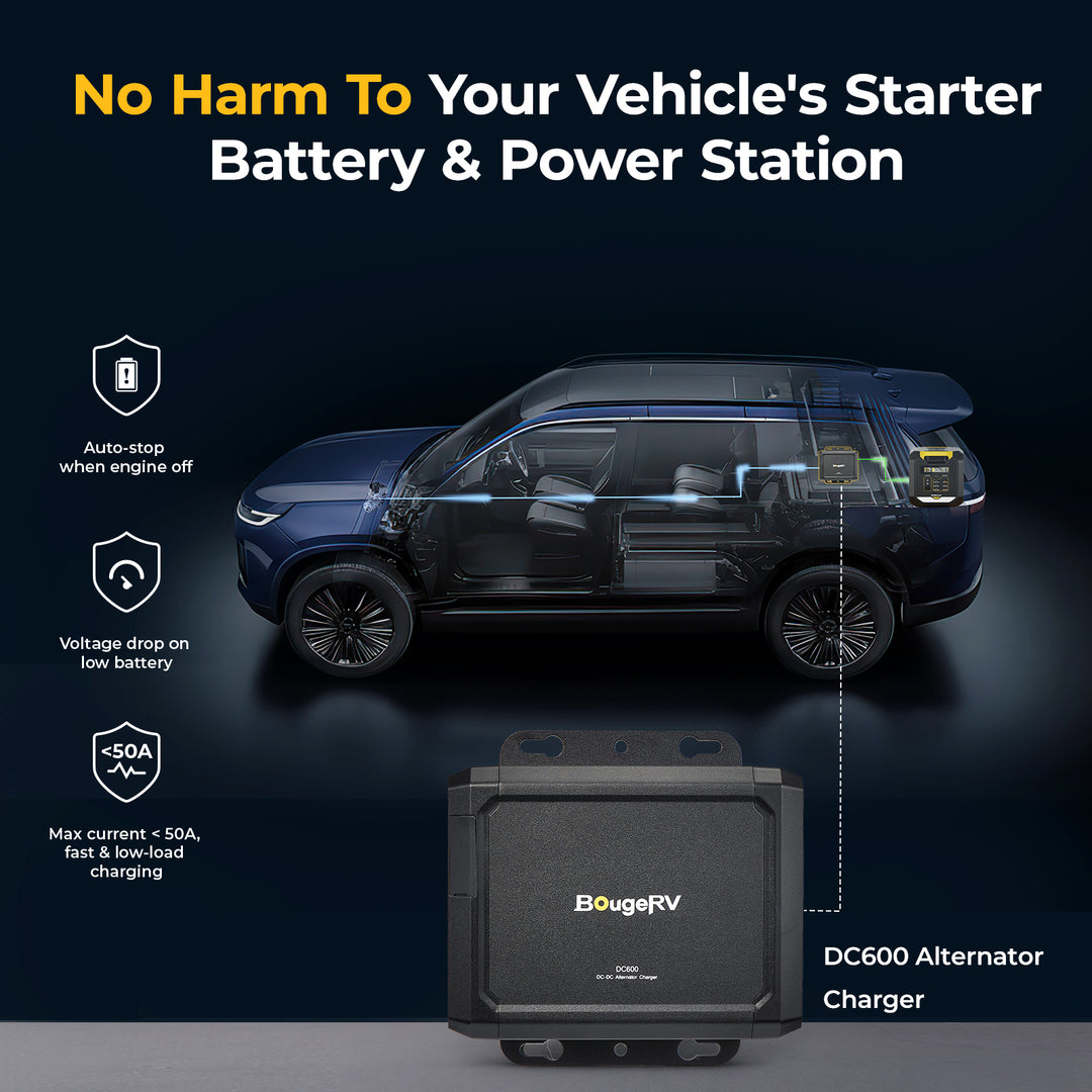 The BougeRV 600W AC Generator Charger is purpose-built for 12V and 24V gasoline or hybrid vehicles. Compatible with most 1–3kWh portable power stations, it features an XT60-to-MC4 output interface for easy, plug-and-play integration. Delivering a flexible and efficient charging experience, it’s ideal for camping, RV travel, or as a dependable emergency power backup.