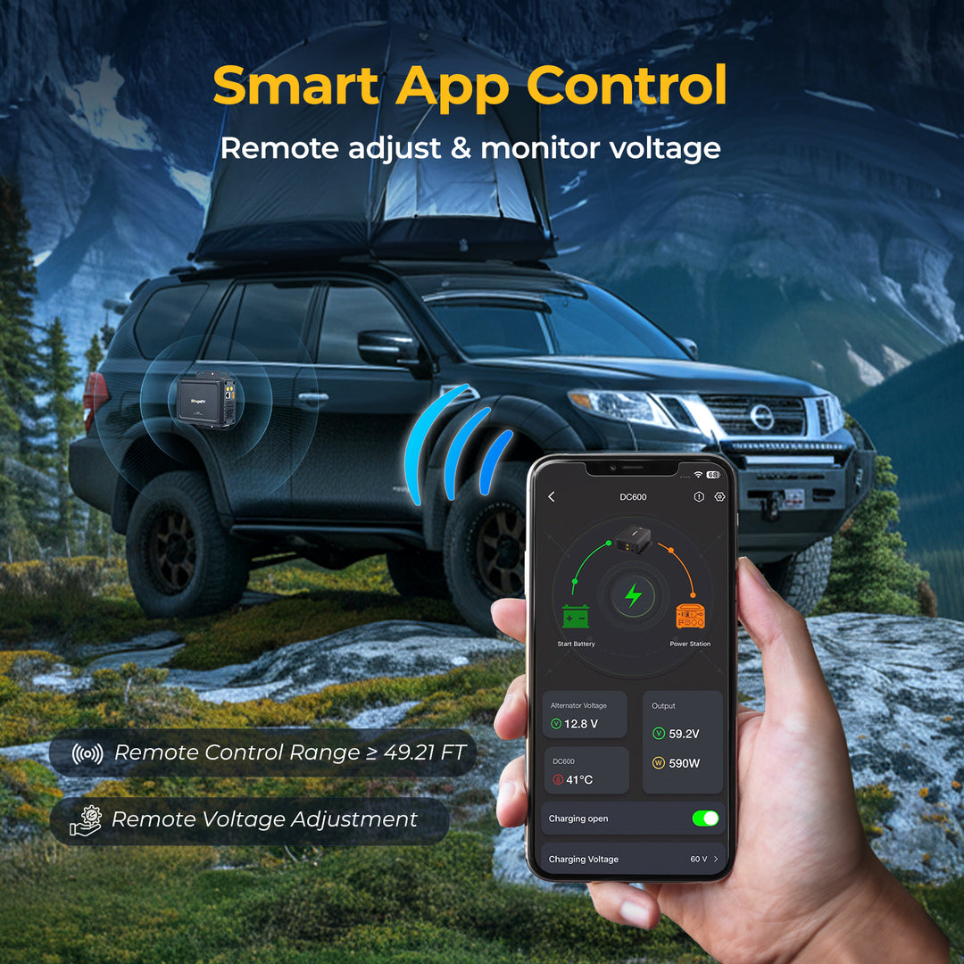 Control your charging system via manual controls or the BougeRV app. Monitor real-time status, adjust voltage/power, and manage performance remotely up to 15m, ideal for portable power stations, RVs, and long-haul travel.