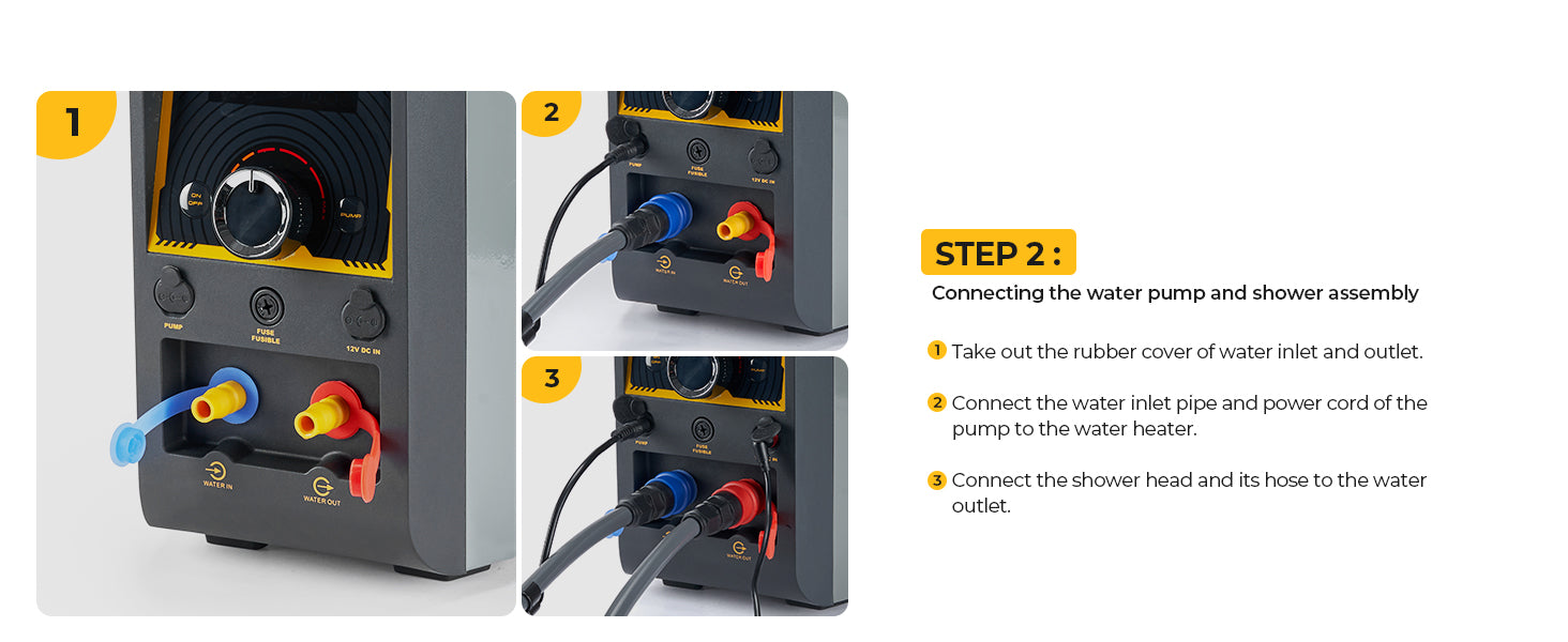 1 * chauffe-eau alimenté au propane pour le camping, 1 * pompe à eau, 1 * adaptateur secteur, 1 * cordon 12 V CC, 1 * régulateur de gaz, 1 * support de douche, 1 * pomme de douche et tuyau d'eau en silicone.