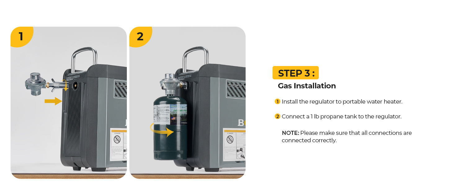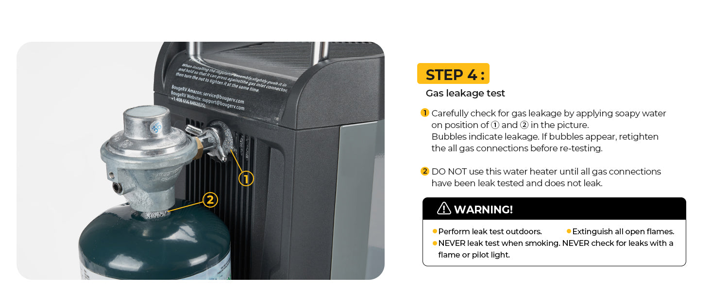 - Type de gaz à utiliser : Ce chauffe-eau de camping utilise un réservoir de propane de 1 lb (453 g). Après avoir installé la bouteille de gaz sur le chauffe-eau, une vérification des fuites de gaz DOIT être effectuée. Ce n’est qu’après avoir déterminé qu’il n’y a pas de fuite de gaz que le chauffe-eau de camping au propane peut être démarré et utilisé.