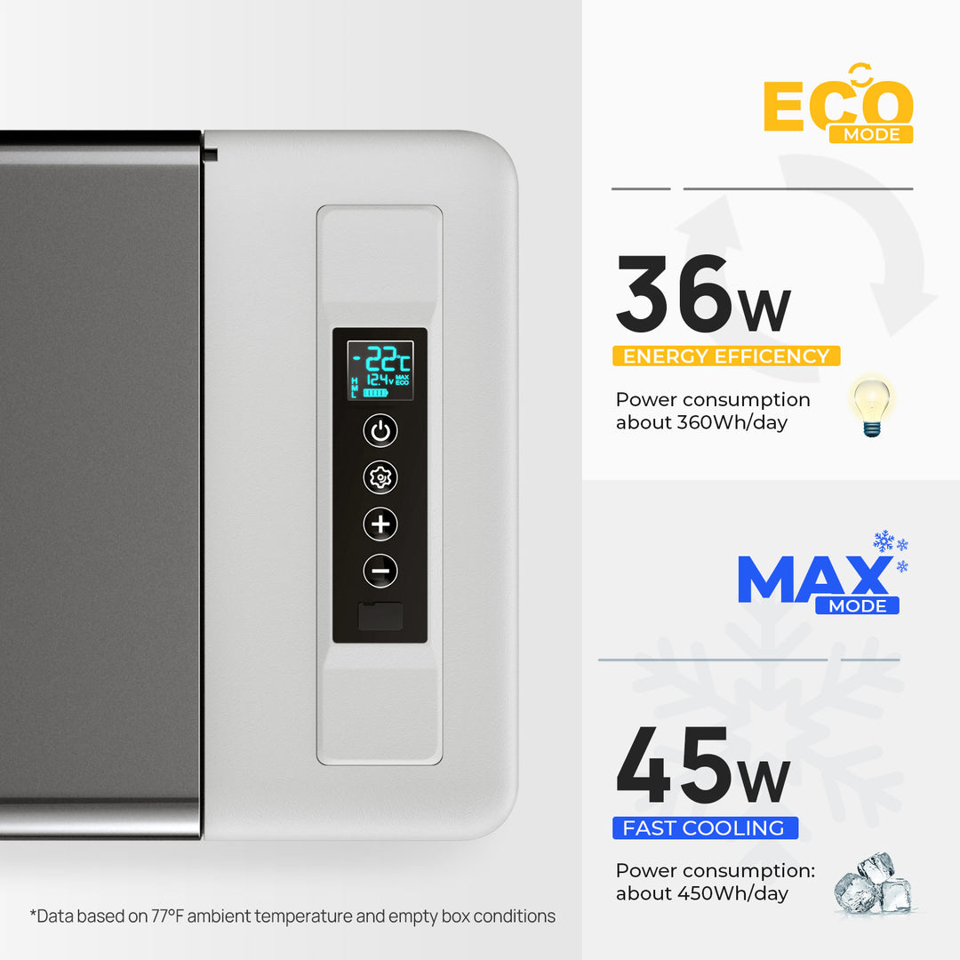 With the ECO mode, the BougeRV Portable Refrigerator consumes less than 36W of power, making it an energy-efficient solution for all your outdoor adventures. The MAX mode uses a smart cycle work that consumes less than 1kWh per day, ensuring minimal power usage while keeping your food and drinks cold.