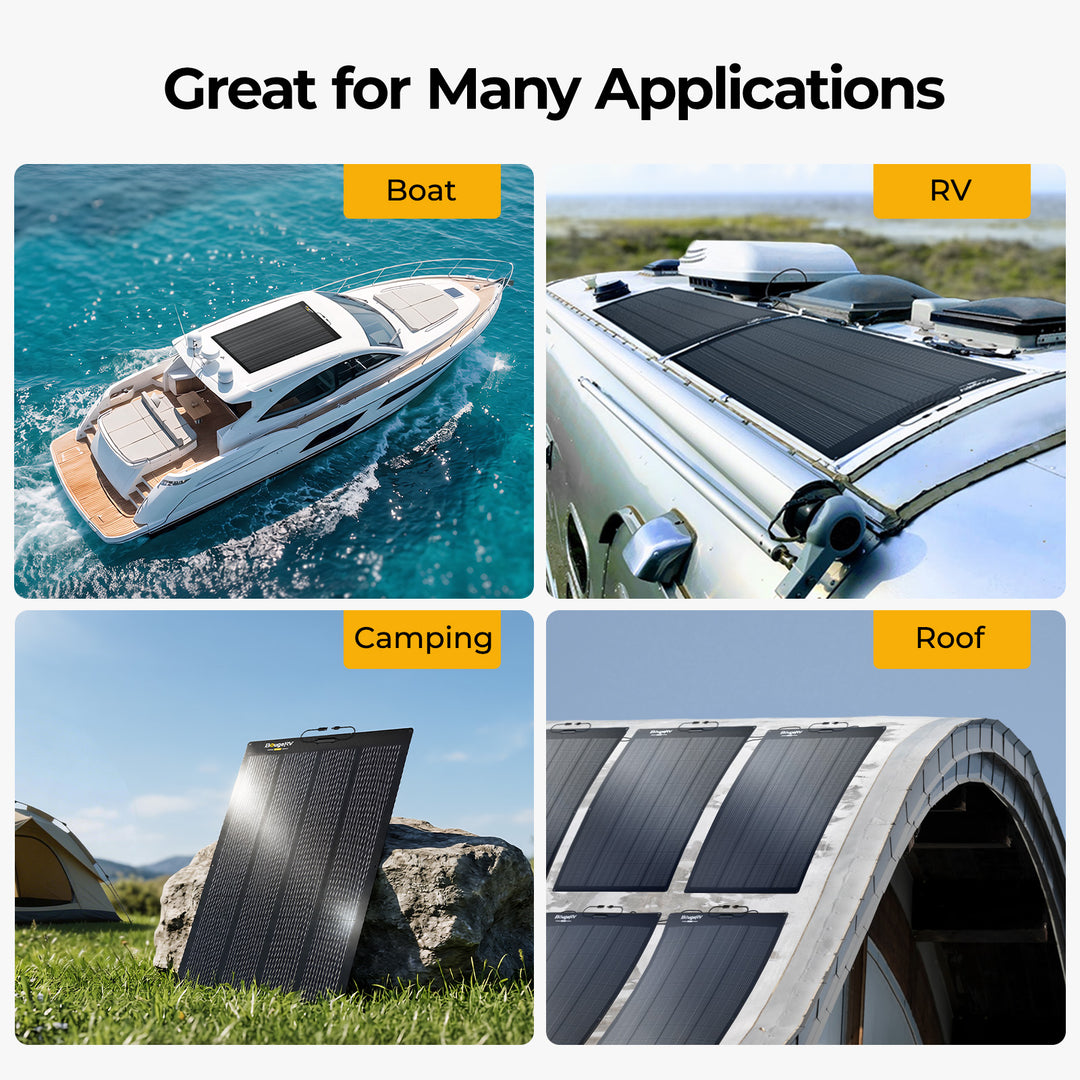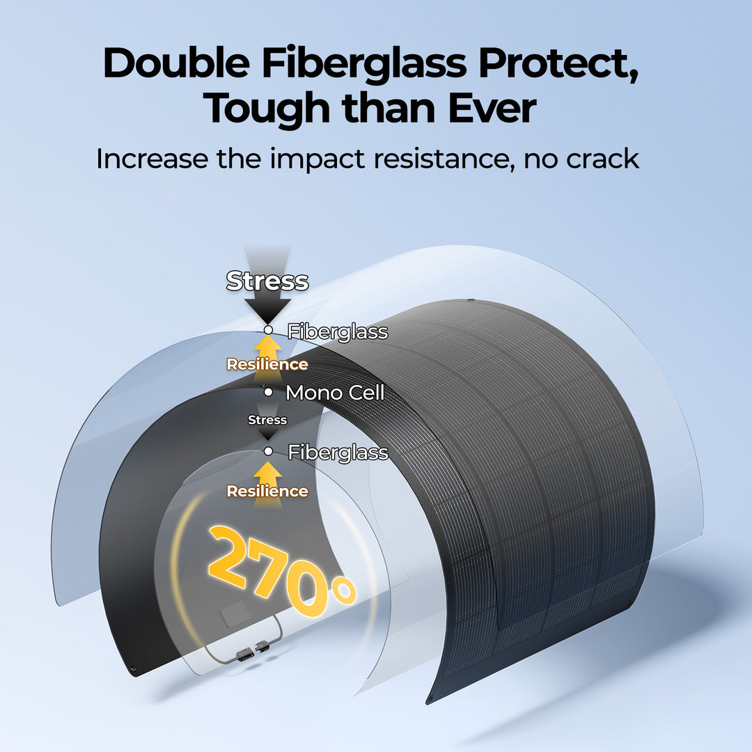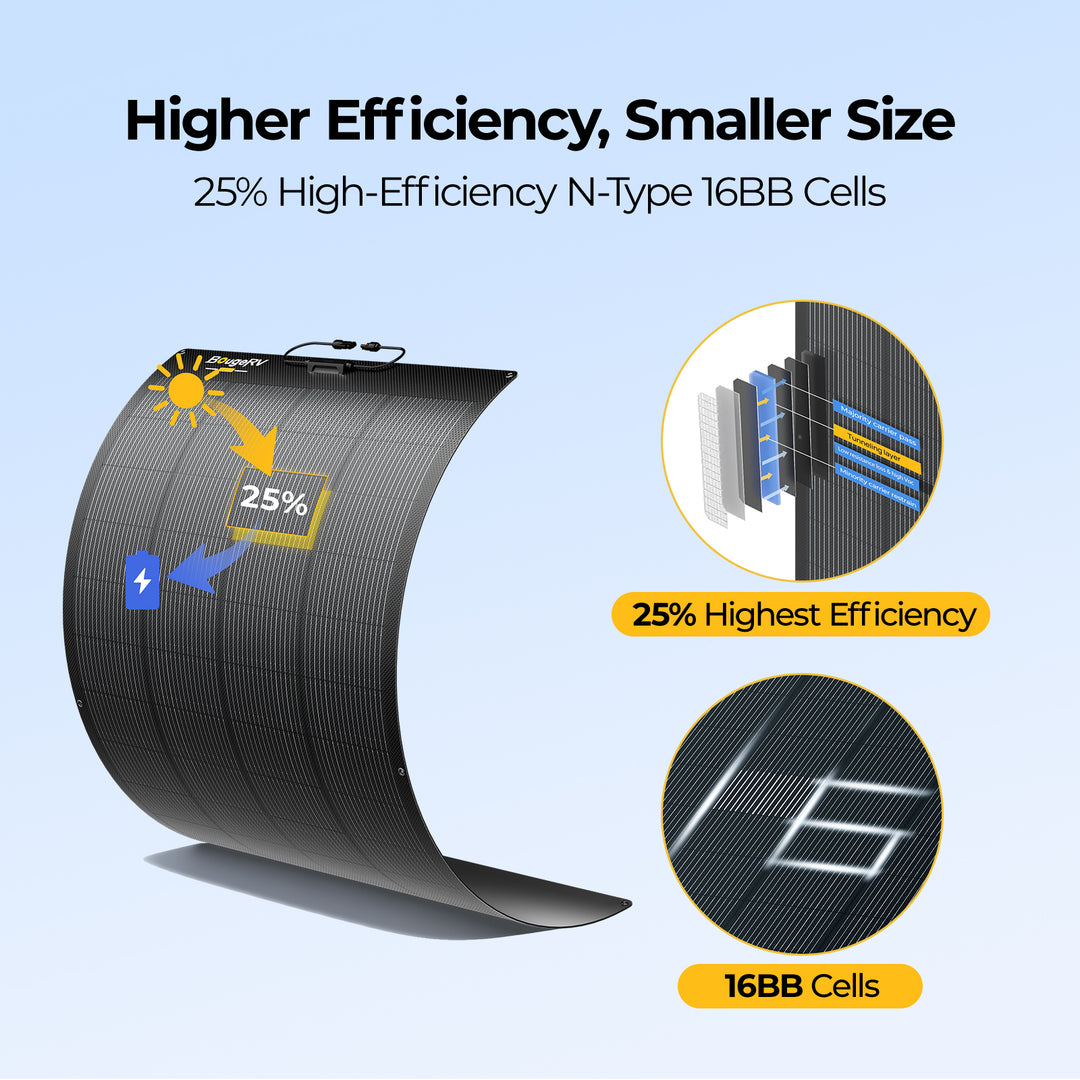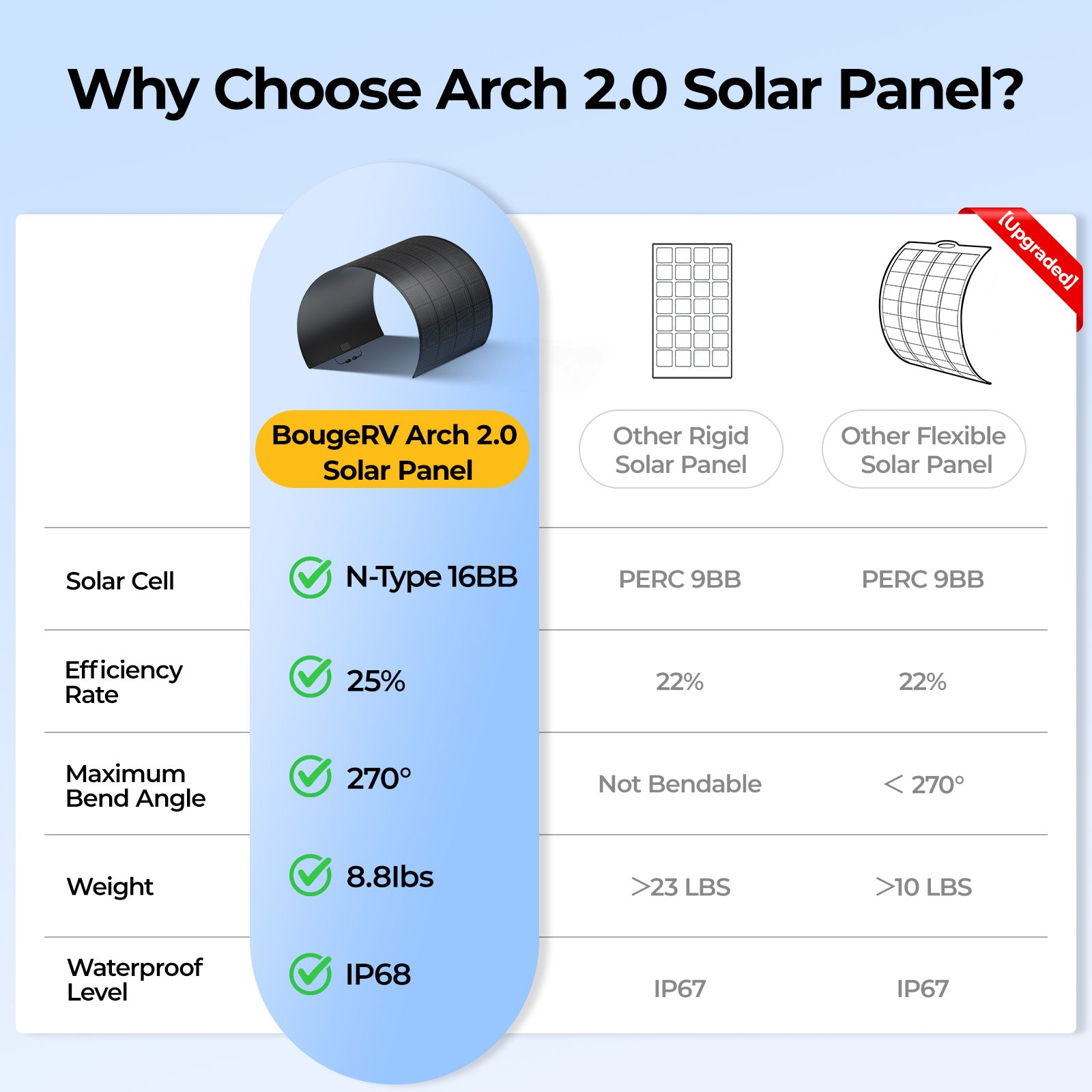 BougeRV Arch 2.0 200W N-Type Fiberglass Flexible Solar Panel – the smart upgrade over the standard Arch. Featuring N-Type TOPCon cells (25% efficiency) and 16BB busbars, it delivers higher energy output and long-term reliability. Compact, lightweight, and bendable up to 270°, it installs easily on RVs, boats, or curved surfaces.