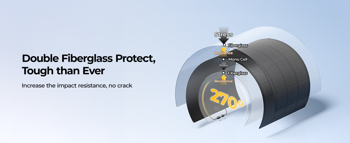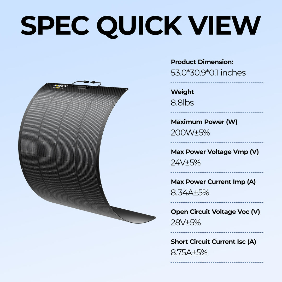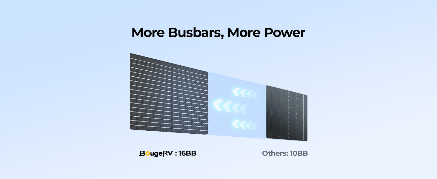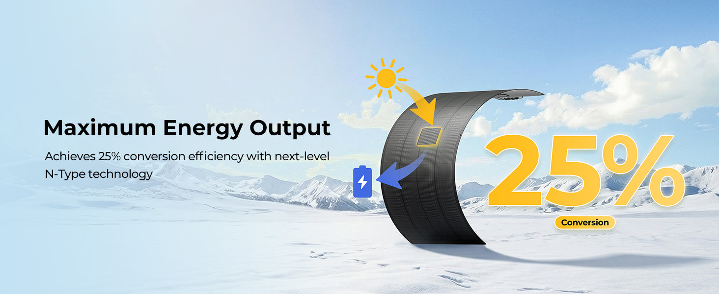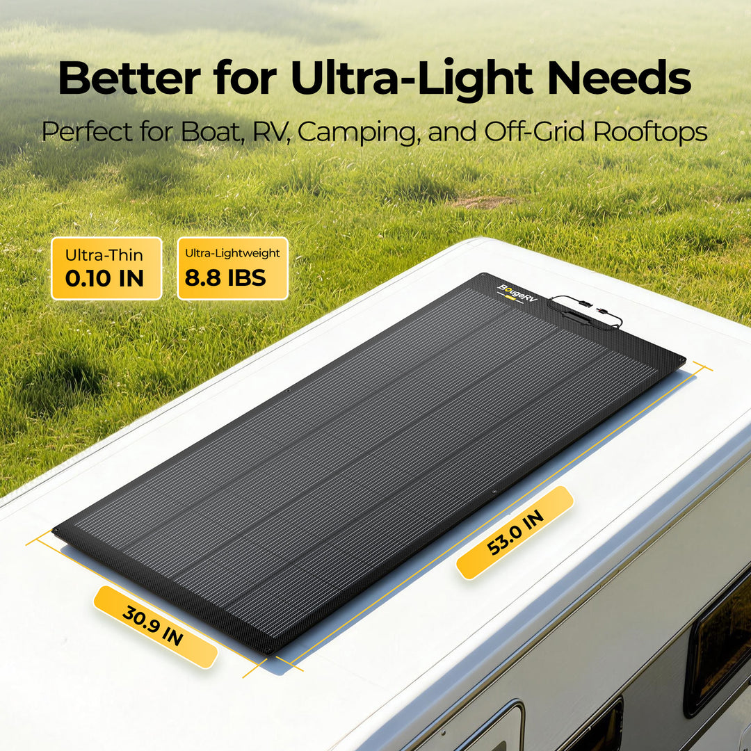 BougeRV Arch 2.0 200W N-Type Fiberglass Flexible Solar Panel – the smart upgrade over the standard Arch. Featuring N-Type TOPCon cells (25% efficiency) and 16BB busbars, it delivers higher energy output and long-term reliability. Compact, lightweight, and bendable up to 270°, it installs easily on RVs, boats, or curved surfaces.