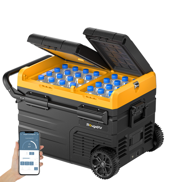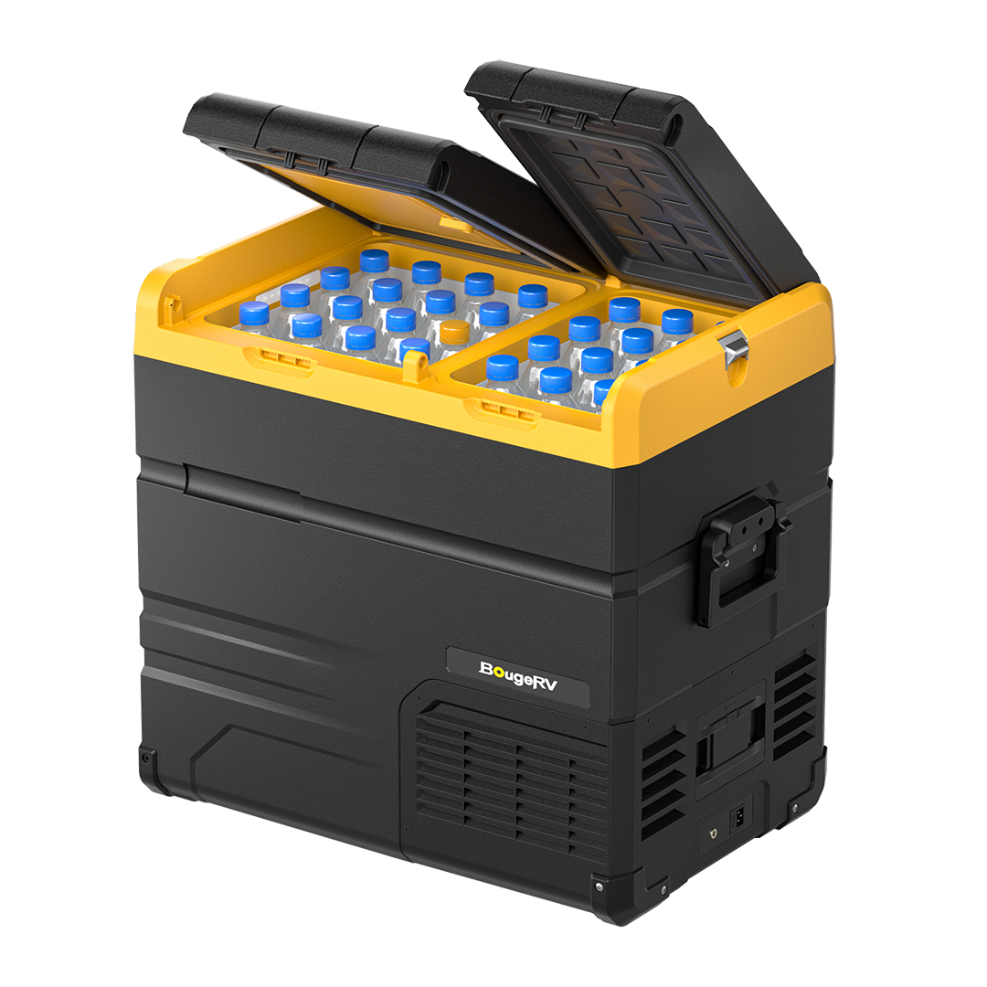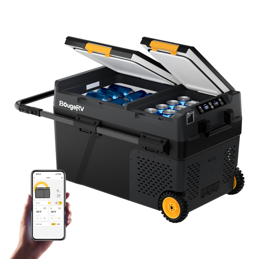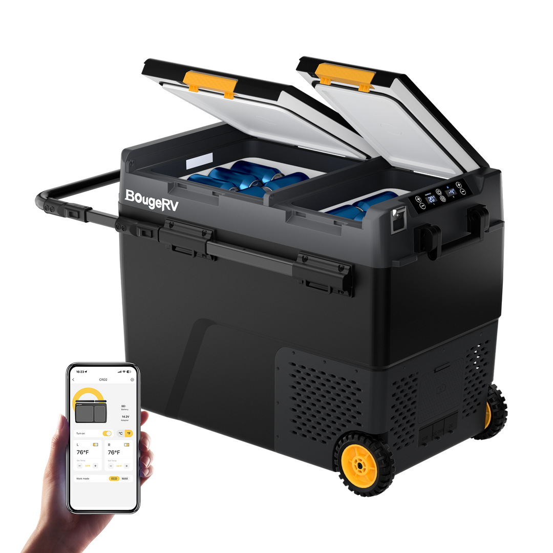 The BougeRV CR Dual-Zone portable fridge freezer features independent temperature control. You can use one side as a refrigerator and the other side as a freezer. Whether you want to keep your drinks chilled or preserve your meats and perishables, this 12v dual zone fridge has got you covered. It also features a handy app to easily and accurately control the temperature settings from your smartphone. Whether you're on a road trip, or camping adventure, or simply need extra cooling space at home, the BougeRV CR Dual Zone fridge is the perfect companion for all your cooling needs.