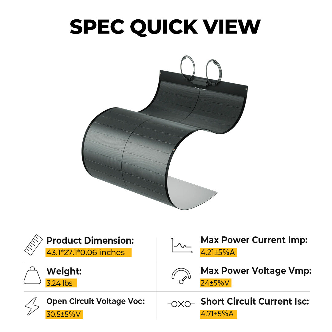 The Yuma 100 Watt Flexible Solar Panel (Square with Holes) is incredibly flexible and can easily be rolled up for compact storage and transportation. It can even be bent and adjusted to fit curved surfaces without cracking.