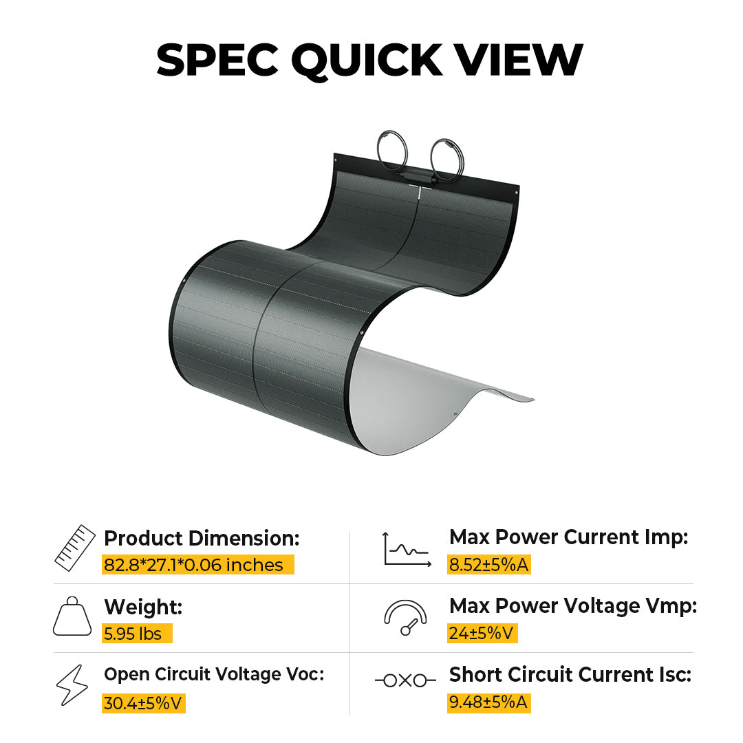 The latest Yuma 200 Watt Flexible Solar Panel with Holes features a new borehole design that enables you to securely fasten it anywhere you desire without any concerns about instability.